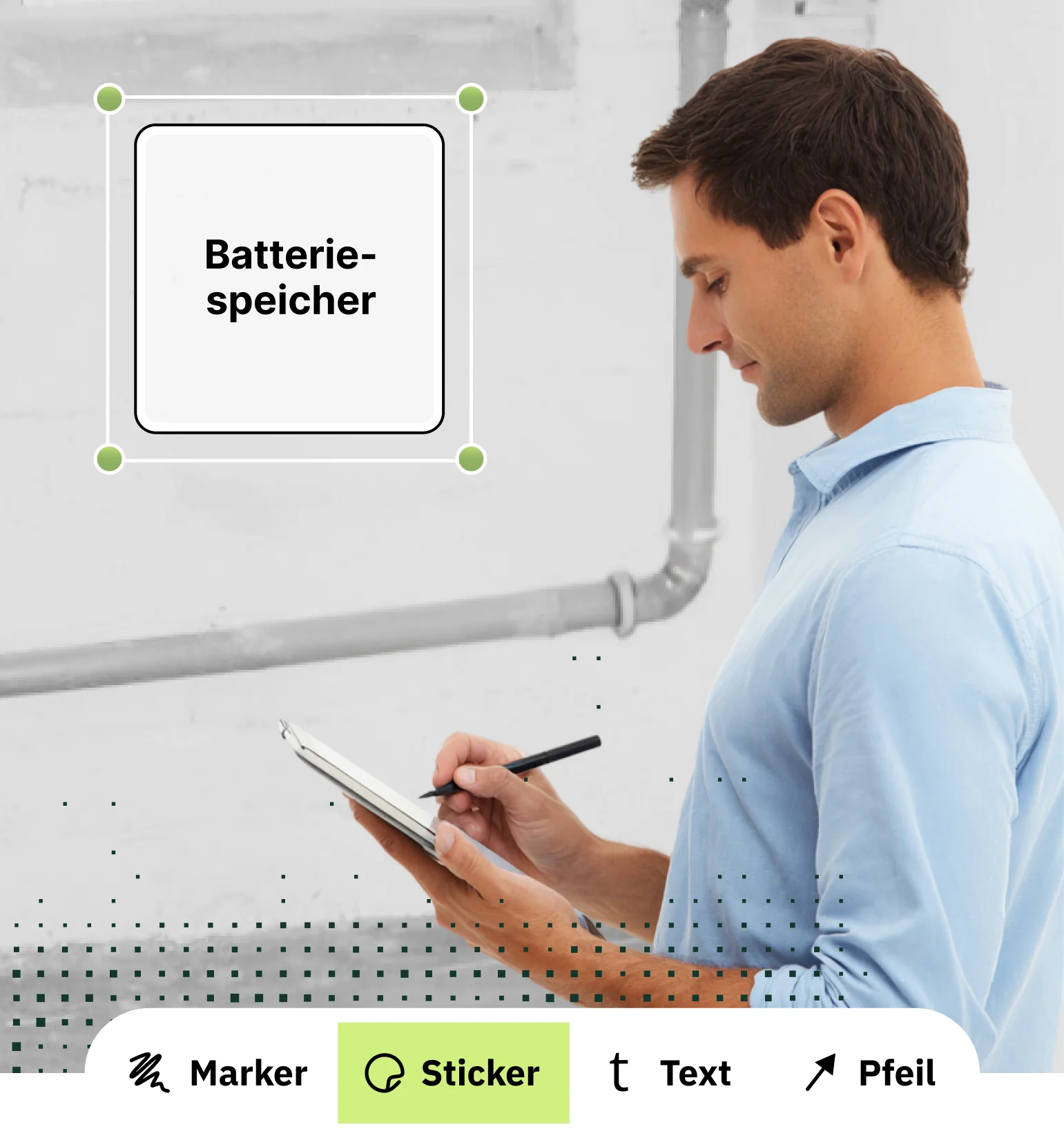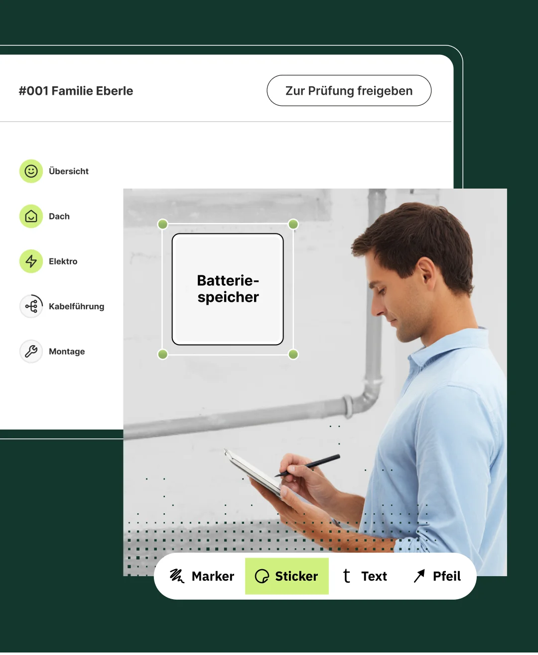 The app with offline mode allows solar consultants to record house data and photos via their tablet. Planned installation locations for PV components are marked on site in the photo editor and coordinated with the customer. This is followed by the technical review and preparation of an offer.